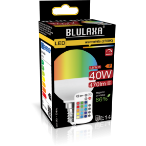 Die LED MiniGlobe aus dem Hause BLULAXA® erstrahlt im warmweißen Licht, welches über die mitgelieferte Fernbedienung nicht nur gedimmt werden kann, sondern auch einen Farbwechsel ermöglicht. Das farbliche Licht verteilt sich, dank opaler Abdeckung, gleichmäßig und sorgt für eine homogene Ausleuchtung. Zusätzlich ist ein E14 Sockel verbaut, der den Anwendungsbereich der LED MiniGlobe 5,5 Watt enorm vergrößert. Die Fernbedienung ist mit allen RGB-Leuchtmitteln kompatibel.