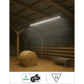 Die LED Feuchtraumleuchten gehören zu den beliebtesten Beleuchtungen. Unsere Profiline ist besonders geeignet für den Betrieb in Ställen, Reithallen, Industrie und Lagerhallen, Scheunen, Stroh -oder Heulager, Futtermittellager, Werkstätten, Garagen, Carports dank "D" zertifiziert gemäß DIN EN 60598 und der geprüften Sicherheit durch die DEKRA.